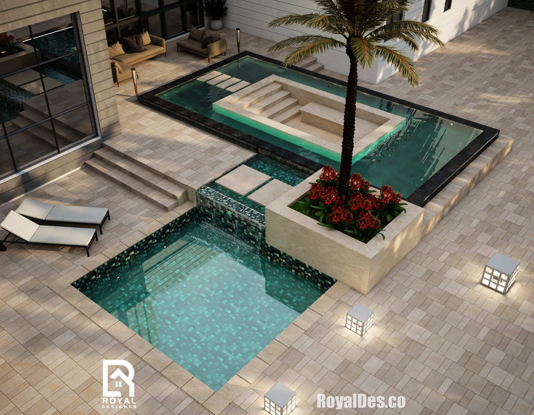 تصميم مسبح + حديقة + جاكوزي + ركن جلوس + كرا ...